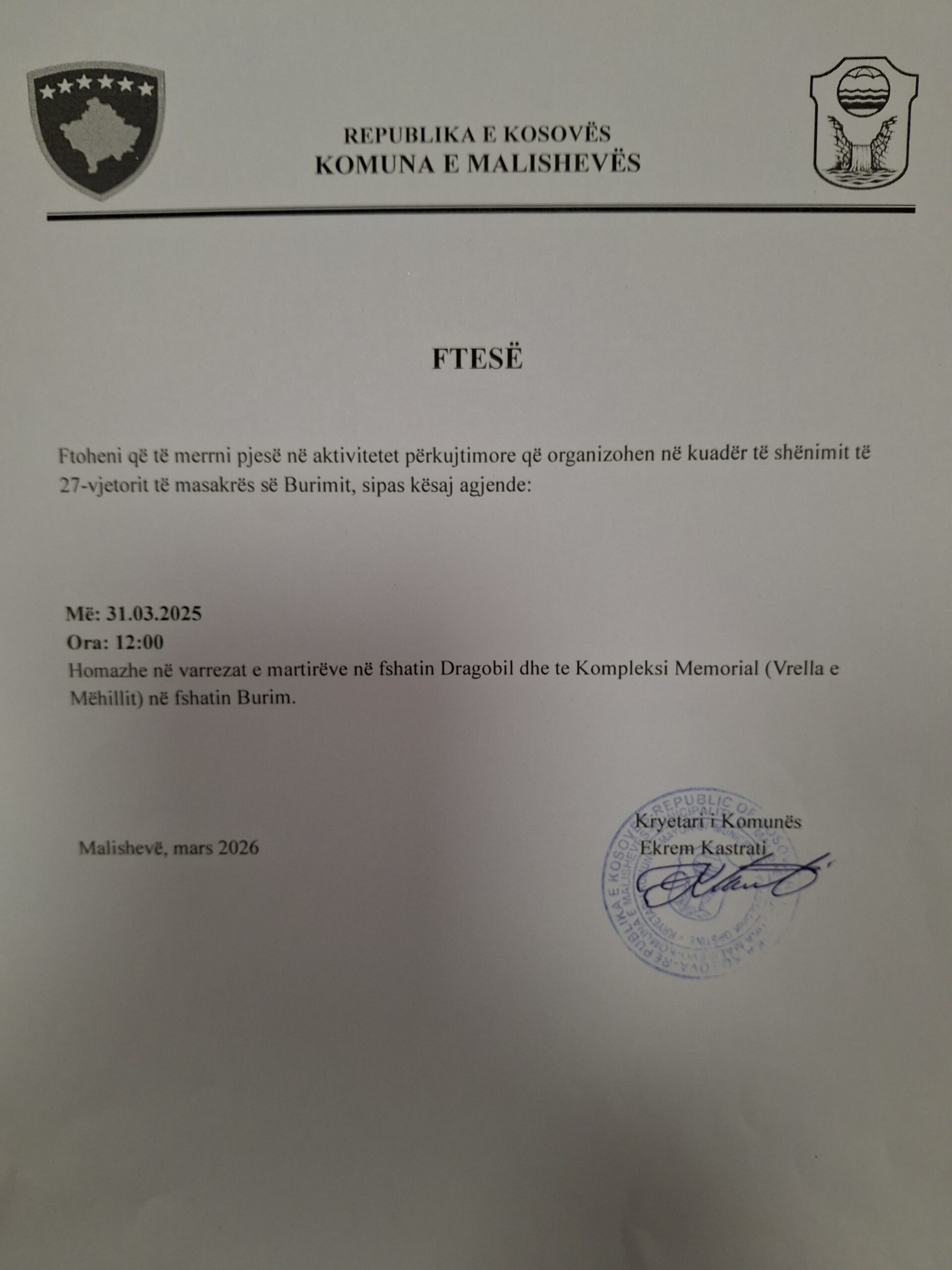 Aktivitetet përkujtimore me rastin e përkujtimit të “Masakrës së Burimit”, do të mbahen më 31 mars, sipas kësaj agjende: